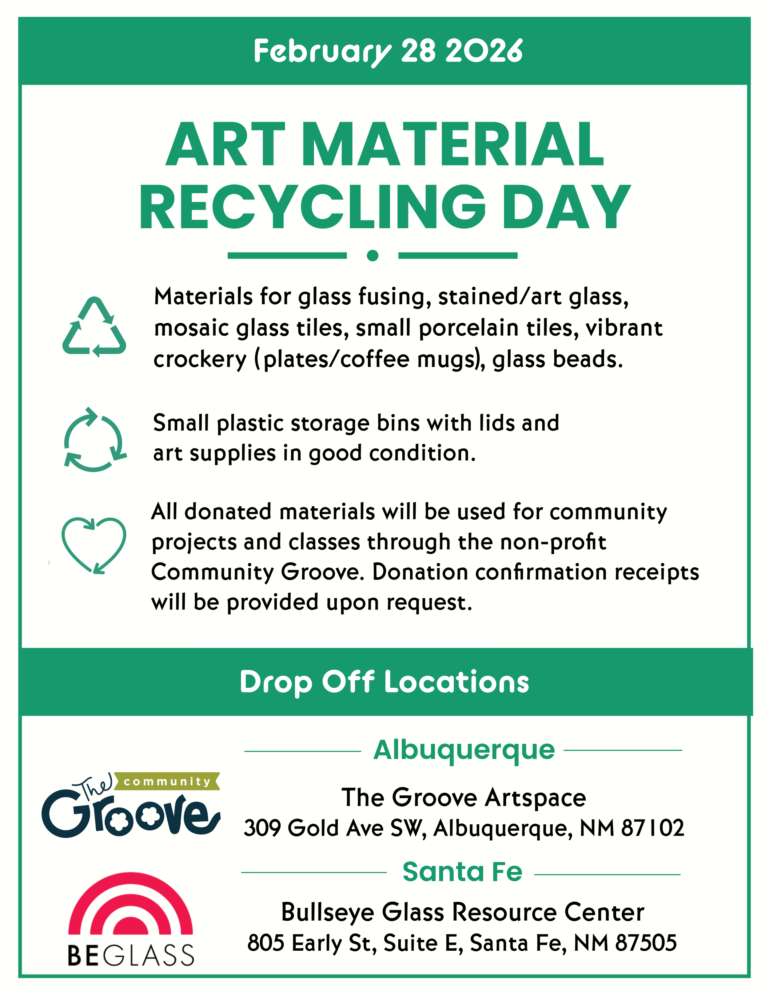 ABQ: Glass/Tile/Art Supply Recycling Saturday, February 28, 2026 10:00 AM 2:00 PM The Groove Artspace 309 Gold Avenue Southwest Albuquerque, NM, 87102 United States (map) Google Calendar ICS